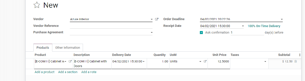 In the RFQ we can make use of the Create Option. Azure Interior has been chosen as the vendor, and a cabinet with doors has been chosen as the product.