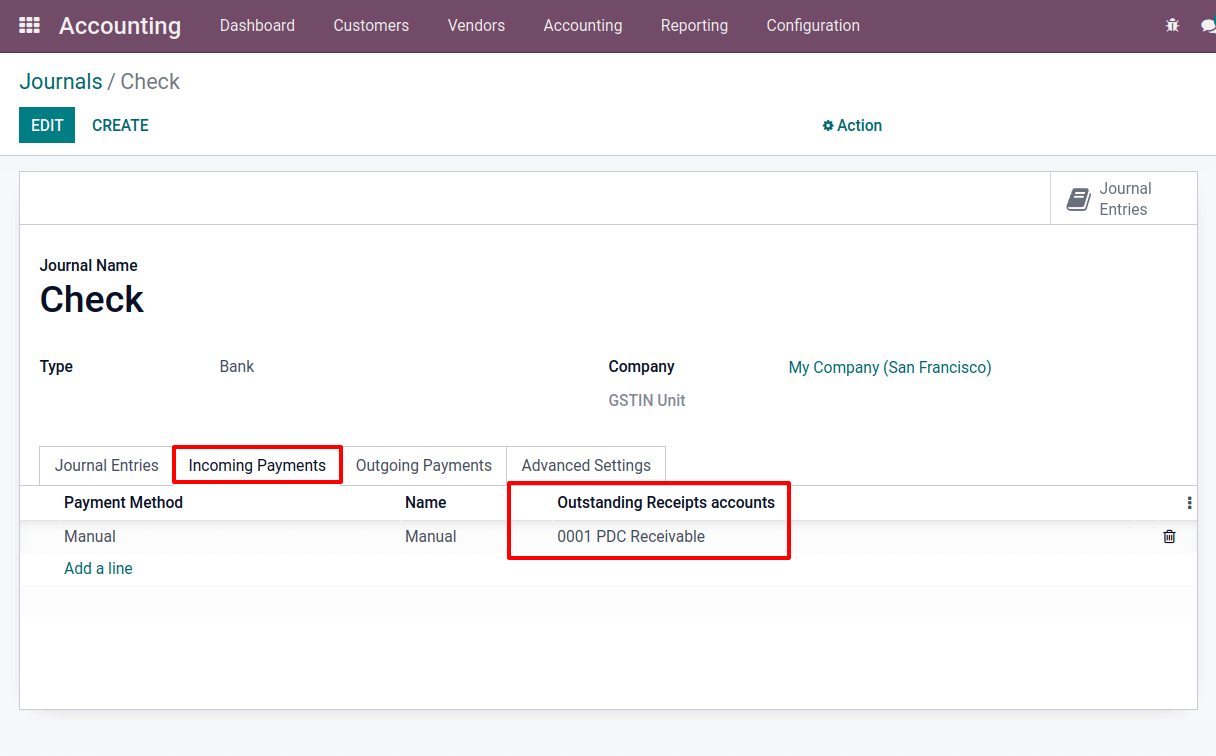 The Odoo platform aids in the efficient management of these processes. When a customer writes a check to us for a future date, the check is known as a Post Dated check (PDC). The check can be cashed or deposited before the expiration date.