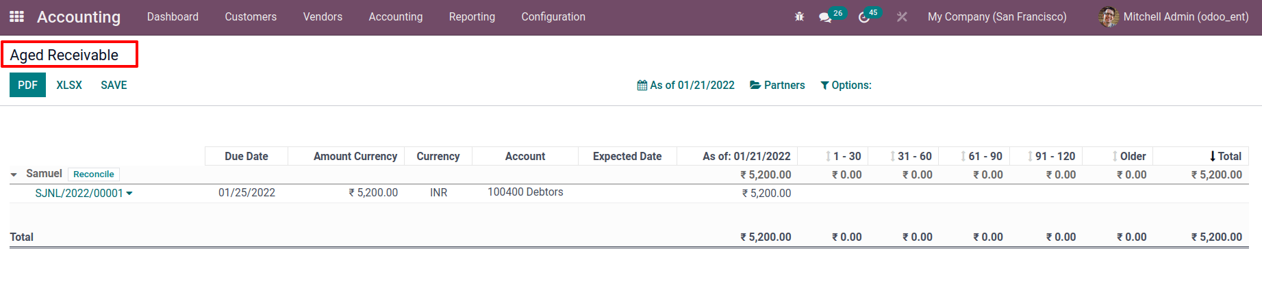 This account will receive any incoming payment entries generated by invoices or cash. During the reconciliation process, transactions will be reconciled with entries on the outstanding receipt account rather than the receivable account. The journal is now produced after you save the page. A $5200 invoice was generated by a customer called Samuel.