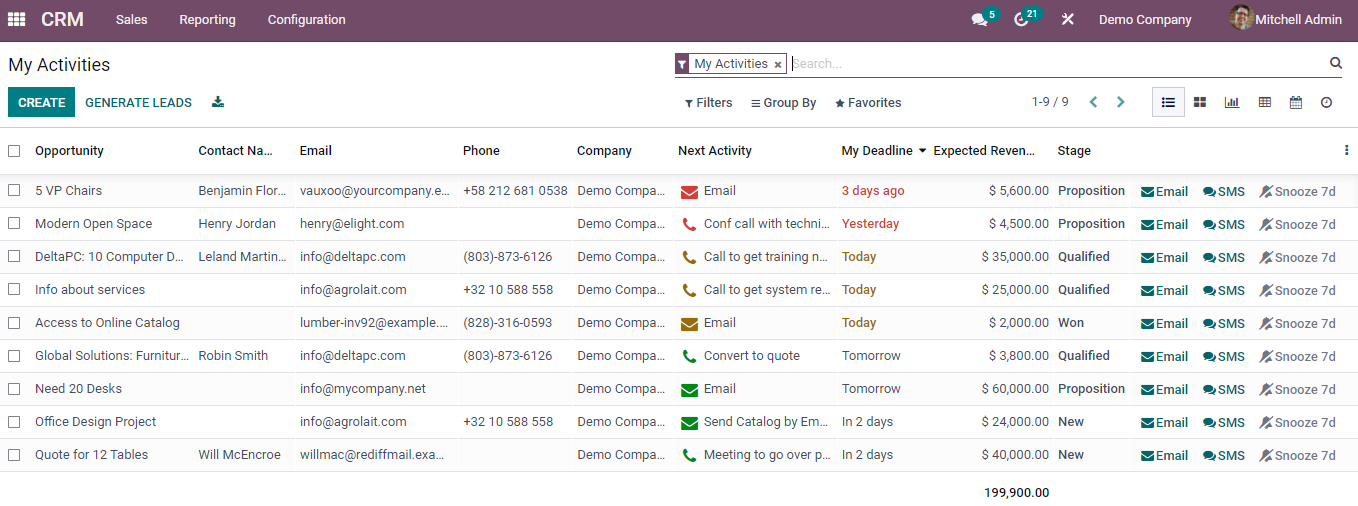 It is possible to plan actions based on your sales scripts in Odoo CRM. Calls to customers, meetings, mailings, and quotations are examples of activities.