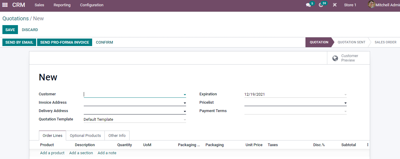 The salesperson can examine the list of quotations he or she has sent by clicking on the My Quotation tab. Various details such as Number, Creation Date, Customer, Salesperson, Next Activity, Company, Total, and Status are included in the Quotation field.