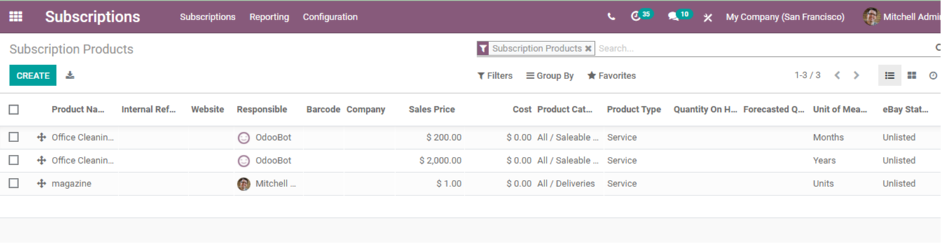 In subscription management, managing subscription items is critical. Odoo Subscription Module aids in the creation and management of subscription products. Select the Subscription Products option from the Subscription tab. Product Name, Internal Reference, Website, Name of the Responsible, Barcode, Company, Sales Price, Cost, Product Quantity on Hand, Forecasted Quantity, Unit of Measure, and eBay Status are all provided for all subscription products.